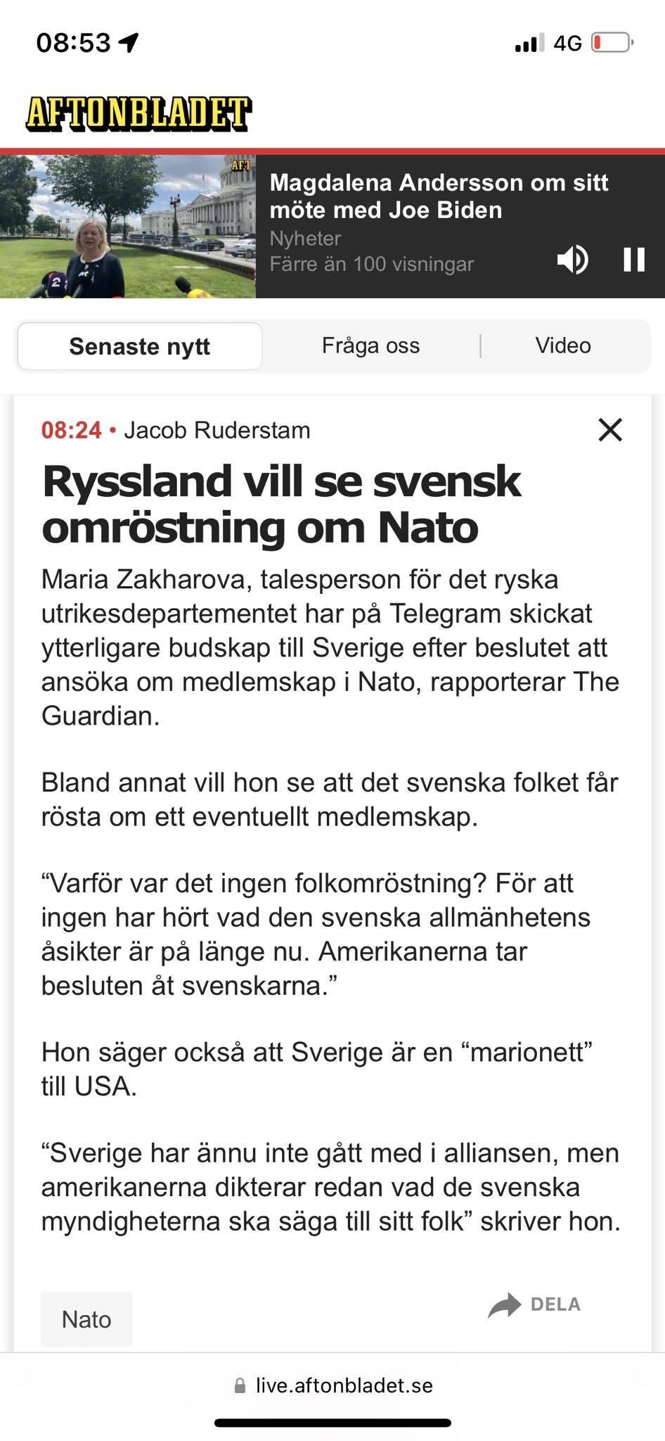 «Швеция ещё не вступила в альянс, но американцы уже диктуют, что шведские власти должны говорить своему народу», — пишет она.